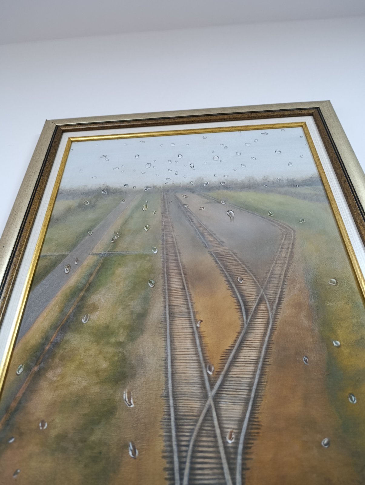 Through raindrops on glass, railway tracks stretch into the mist, diverging into unknown directions. The scene captures a moment of quiet reflection…