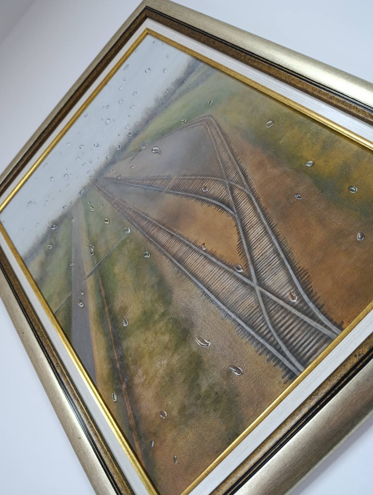 Through raindrops on glass, railway tracks stretch into the mist, diverging into unknown directions. The scene captures a moment of quiet reflection, evoking choices, journeys, and the uncertainty of paths ahead. Each droplet adds depth, as if time itself pauses between one decision and another.